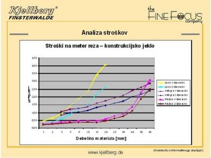 Predstavnik podjetja Kjellberg Finsterwalde (g. Alfred Gierschke) je predstavil zanimivo in podrobno empirično analizo primerjave stroškov rezanja različnih debelin pločevine s plazmo in njej alternativnimi postopki. Rezultati analize so bili vsekakor zanimivi, saj se je pokazalo, da v proizvodnji pogostokrat spregledamo fiksne stroške pri kalkulaciji cene rezanja. Prav tako postaja vse pomembnejši dejavnik čas oz. trajanje določenega tehnološkega postopka in kakovost. Slednji dejavniki so jeziček na tehtnici nagnili v prid plazemski tehnologiji, kar prikazujeta spodnja tabela in graf.