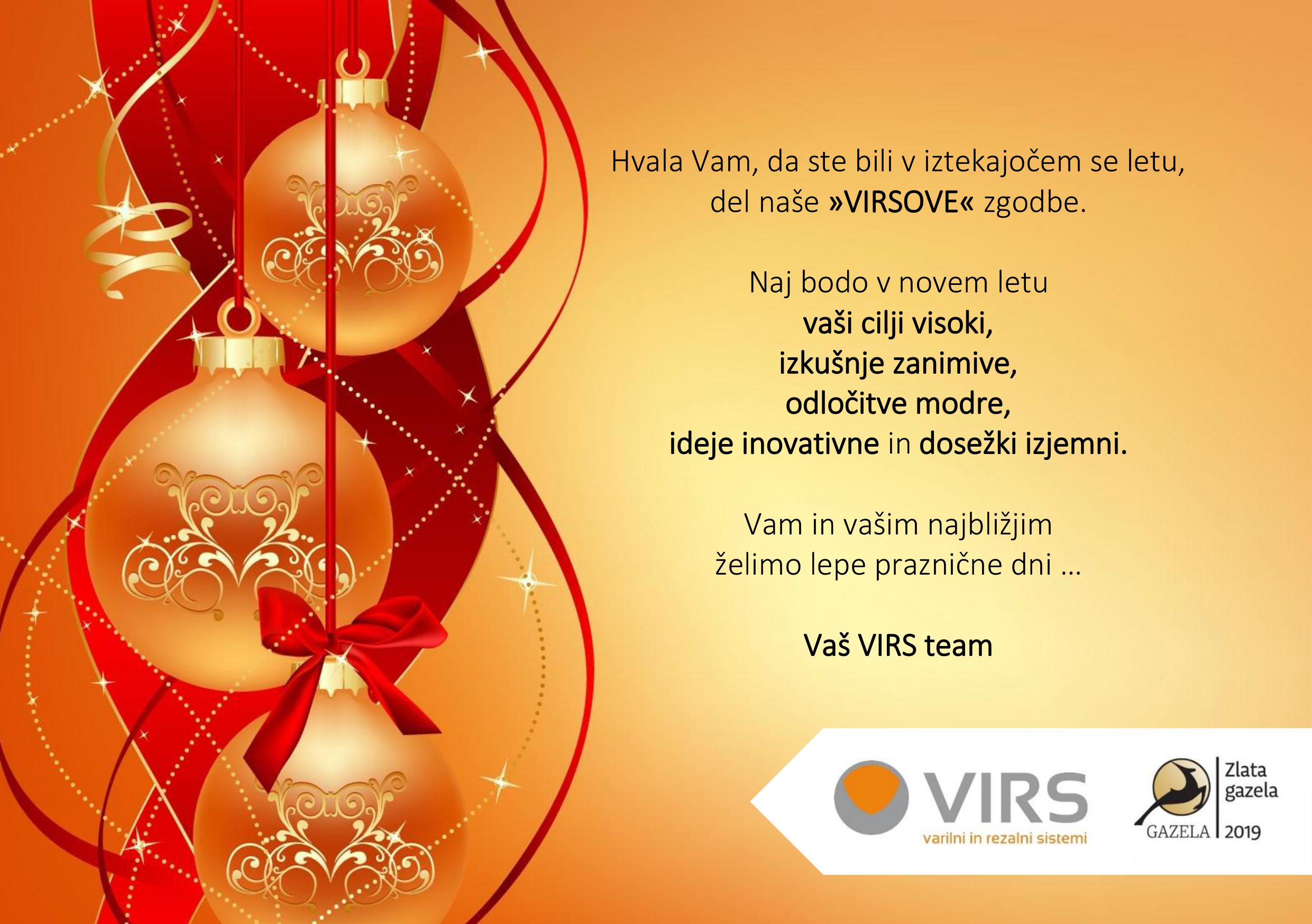 "Virsovci" imamo v času božično - novoletnih praznikov kolektivni dopust (23. december - 06. januar). Ponovno smo Vam na voljo v ponedeljek, 6. januarja 2020.